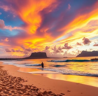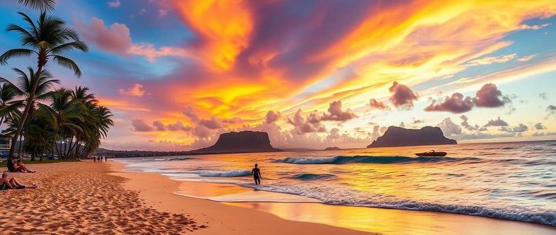 A vibrant scene of Waikiki Beach at sunset, with golden sands, gentle waves lapping at the shore, palm trees swaying in the breeze, and a colorful sky filled with hues of orange, pink, and purple reflecting on the water. In the background, the iconic Diamond Head crater silhouetted against the horizon. A few surfers riding waves and beachgoers relaxing on towels, capturing the essence of paradise in Oahu.
